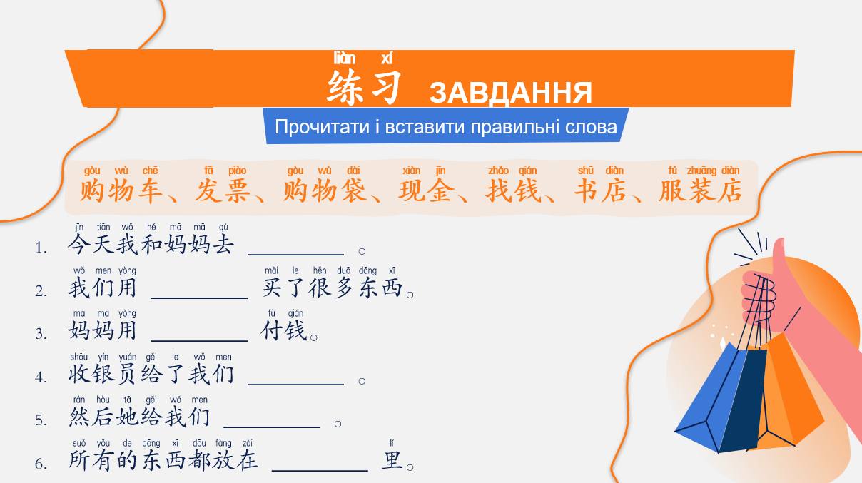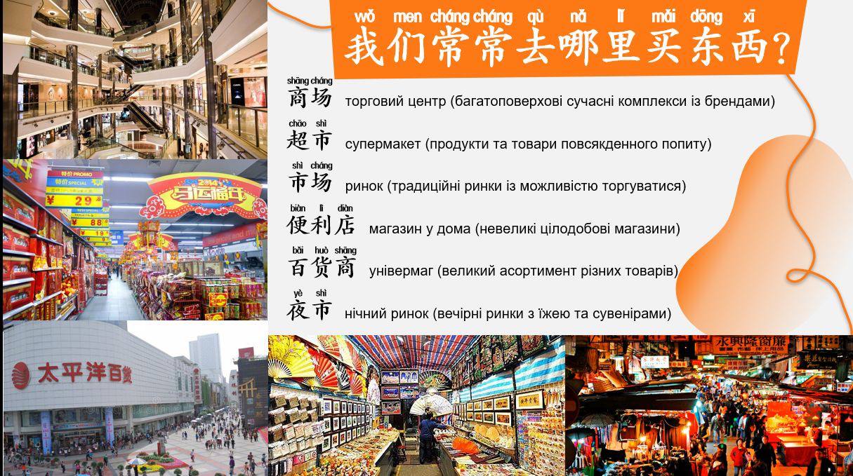 -тренувалися ставити запитання в магазині, платити й отримувати решту китайською мовою,